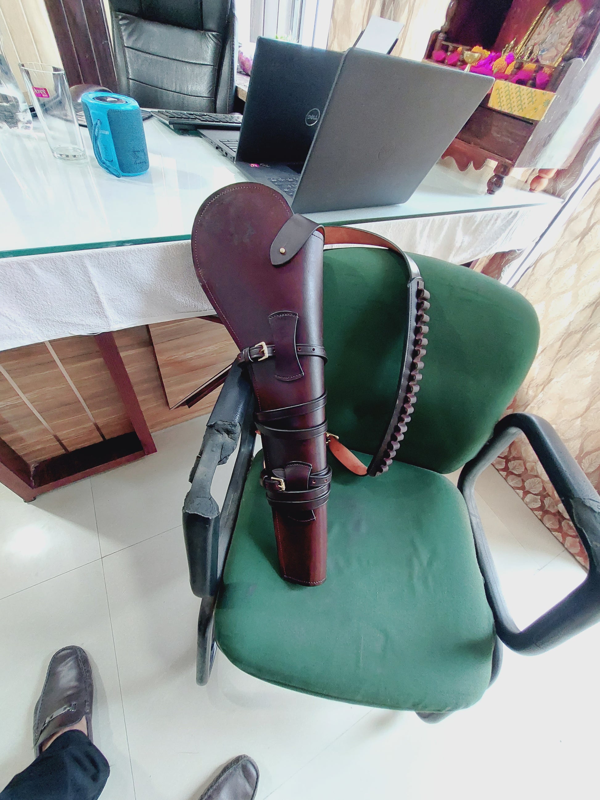 The reinforced body, triple leather strap system, and gold-tone buckles ensure secure fit and long-lasting durability. Its padded shoulder strap offers comfortable carry while the optional ammo loop upgrade adds practical western flair.