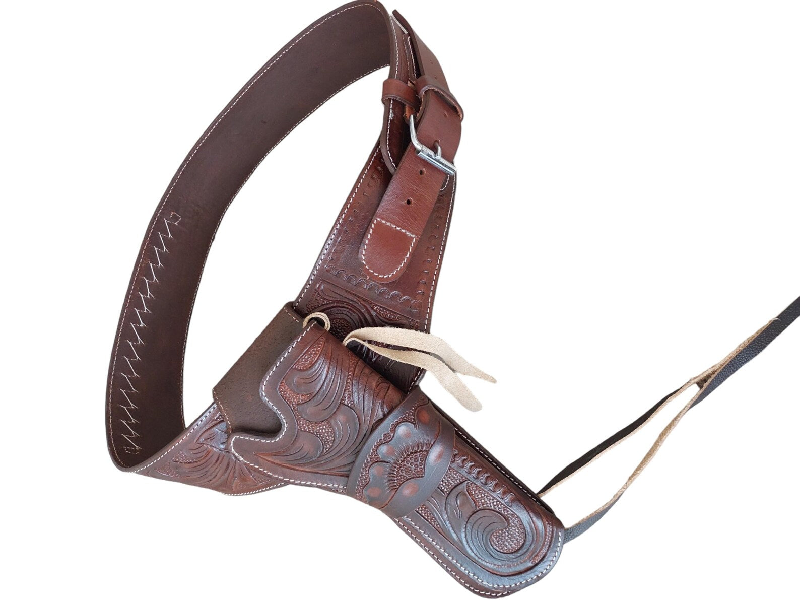 Authentic Cowboy Styling: Hand-tooled floral patterns give this holster belt a classic Old West appearance.