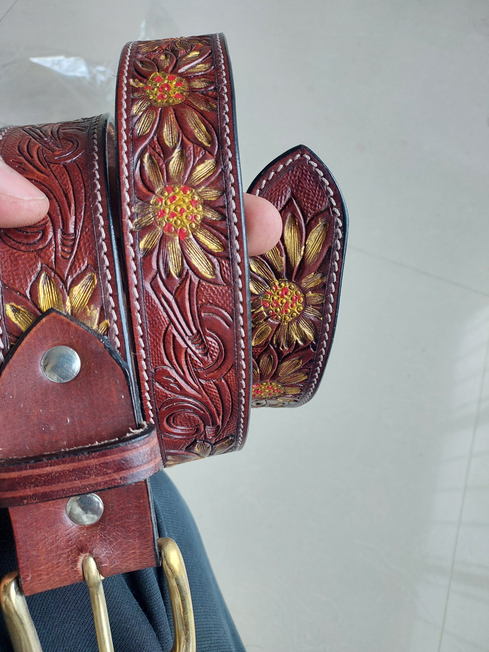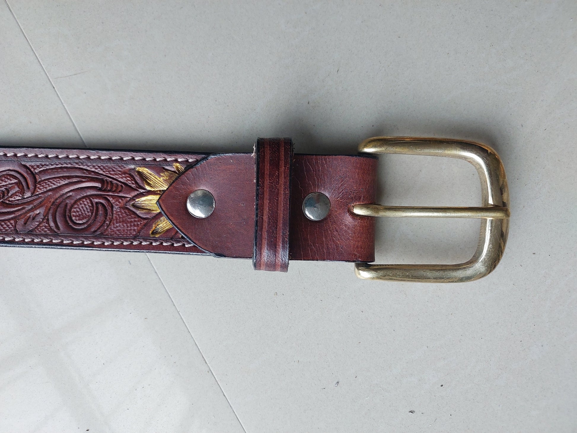 Western Cowboy Belt for Men – Handmade Carved Leather with Brass Buckle